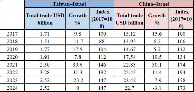 Israeli experts have debated the rapprochement between Tel Aviv and Taipei in the context of Israel’s China policy. Israel has largely welcomed and responded positively to Taiwan’s outreach. Yet, while agreeing on the emotional dimension of the “shift” – motivated by shared values and geopolitical similitarities – they caution that careful balancing is required to maintain relations with Beijing. After all, Galia Lavi explained that despite the low media profile, Chinese trade with Israel did not stop during the war in Gaza (as shown in the graph below), and Chinese workers remained in the country even “under the threat of missiles.”[43]